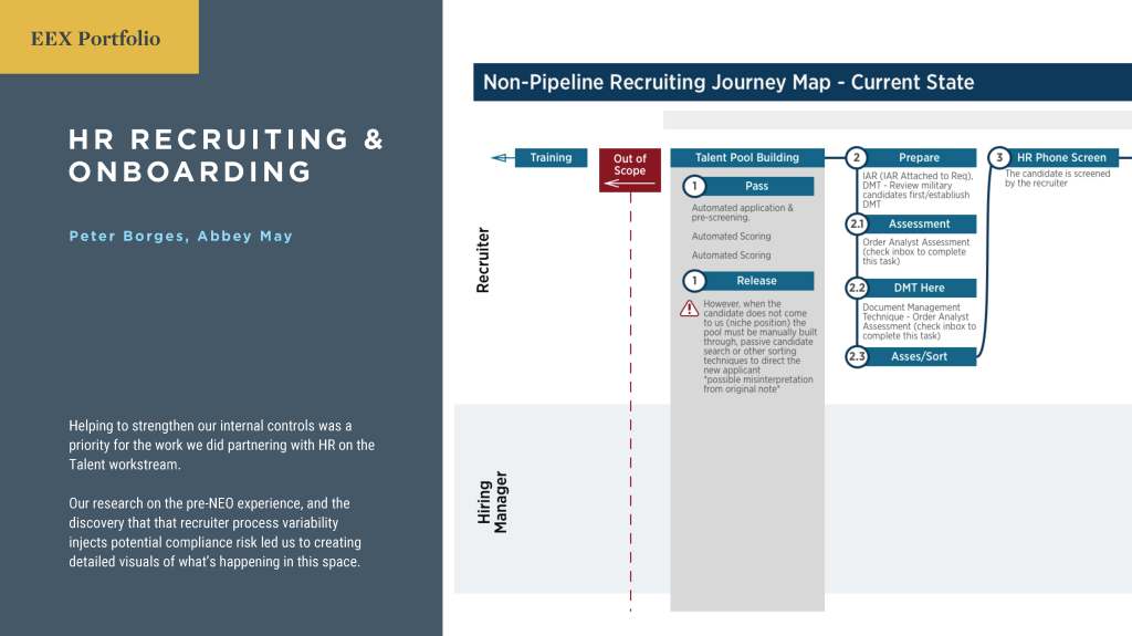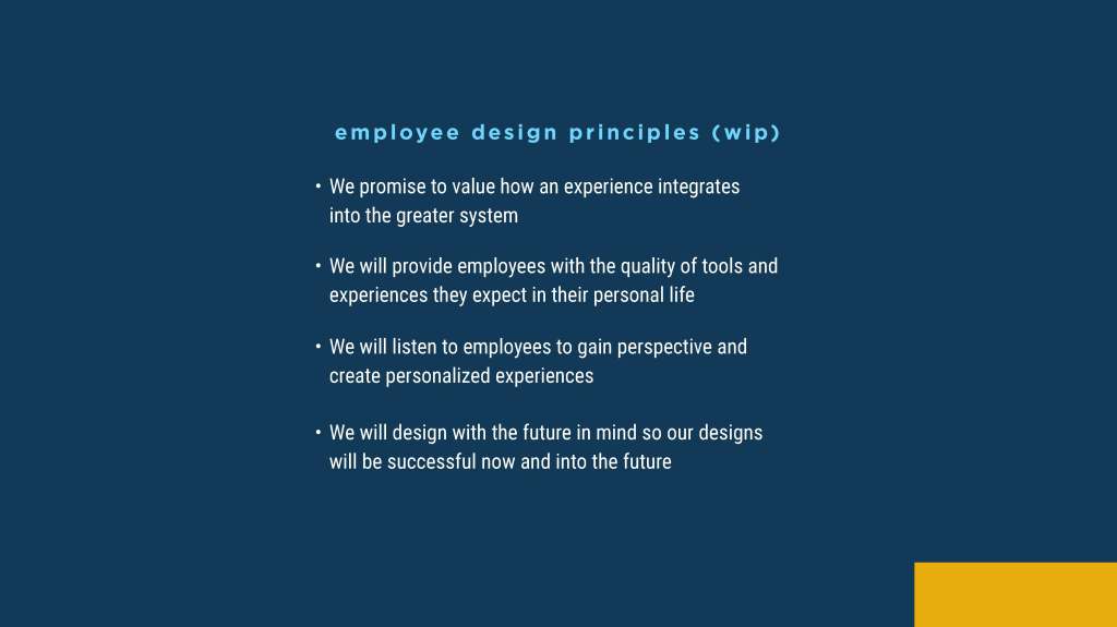 Exploring different solutions using the Human Centered Design approach for internal experience was bringing new focus to Employee Experiences. Reducing what I call “cognitive debt” created when a lack of user research or not understanding the “job to be done” while creating employee work tools. Imposing imperial perspectives over how tools are designed is detrimental to the effectiveness and productivity of users. Providing those specific users (the workforce) with effective tools not only increases productivity but enables those individuals to become better at their jobs, no matter if it’s customer facing or in a specific specialty, rather than expending energy and cognition “learnign the system: and overcoming technical barriers.